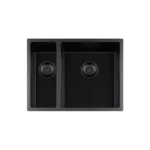 Zwarte dubbele spoelbak met de kleine bak rechts en ronde zwarte korfplug.